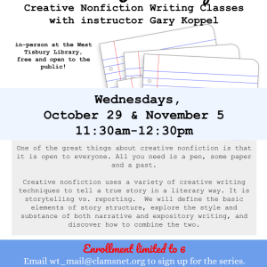 APPOINTMENT ONLY PLEASE Digital Navigation Technology Assistance by appointment Wednesdays from 11 am – 1 pm. Do you need help navigating the internet, using a smartphone or tablet, or other technology questions? Call the library at 508-693-3366 or email rrooney@clamsnet.org to set up an appointment. Appointment , ...CLASS FULL! What’s Your Story? Creative Nonfiction Writing Classes with Gary Koppel11:30 am - 12:30 pm