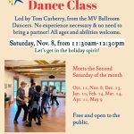 On the second Saturday of the month, from 11:30am-12:30pm, come to a free Ballroom/Partner Dance Class led by Tom Carberry, from the MV Ballroom Dancers. No experience necessary & no need to bring a partner! All ages and abilities welcome. Meets Oct. 11, Nov. 8, Dec. 13, Jan. 10, Feb. 14, Mar. 14, Apr. 11, and May , ...Ayurvedic Lifestyle and Diet for Balance in the Fall1:00 pm - 2:00 pm