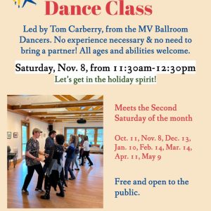 On the second Saturday of the month, from 11:30am-12:30pm, come to a free Ballroom/Partner Dance Class led by Tom Carberry, from the MV Ballroom Dancers. No experience necessary & no need to bring a partner! All ages and abilities welcome. Meets Oct. 11, Nov. 8, Dec. 13, Jan. 10, Feb. 14, Mar. 14, Apr. 11, and May , ... - 9MVLA Costume Collection Drop off- for next years “Costume Swap”10:00 am - 5:00 pm