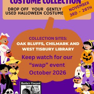 Drop off your gently used, clean Halloween costumes at any participating library. (Chilmark, Oak Bluffs or West Tisbury Library)