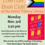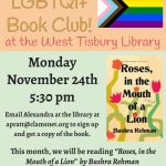 Join us at the West Tisbury Library on Monday, Nov. 24, at 5:30 PM for our LGBTQI+ Book Club! This month, we will be reading Roses, in the Mouth of a Lion, by Bushra Rehman. This group is facilitated by West Tisbury Librarian Alexandra Pratt. Email Alexandra [apratt@clamsnet.org] or the library at wt_mail@clamsnet.org , ... - 25MVLA Costume Collection Drop off- for next years “Costume Swap”10:00 am - 5:00 pm