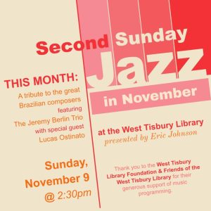 On Sunday, November 9, at 2:30pm, all are invited to a jazz concert at the West Tisbury Library featuring The Jeremy Berlin Trio with special guest Lucas Ostinato. A tribute to the great Brazilian composers. Free and open to the public. , ...