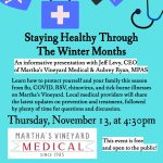 On Thursday, November 13, at 4:30pm, join us at the West Tisbury Library for an informative presentation with Jeff Levy, CEO of Martha’s Vineyard Medical & Aubrey Ryan, MPAS. Learn how to protect yourself and your family this season from flu, COVID, RSV, rhinovirus, and tick-borne illnesses on Martha’s Vineyard. Lo , ...Stitch Society Craft Group5:00 pm - 6:00 pm