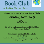 Come join us for our Climate Book Club at the West Tisbury Library! Our next meeting will be Sunday, Nov. 16, at 4:00pm. We will be reading and discussing Bill McKibben “Here comes the Sun”. This group is facilitated by Nicola Blake and Sue Hruby. Email the library at wt_mail@clamsnet.org to sign up and get your copy , ...