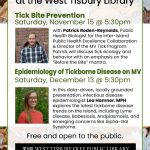 On Saturday, November 15, at 5:30pm, join us at the West Tisbury Library for a Tick Bite Prevention Talk with Patrick Roden-Reynolds. Patrick will discuss tick ecology and behavior with an emphasis on the “Before the Bite” mantra. He will cover the most important prevention tactics to help keep you safe while outdoors. , ... - 16MVLA Costume Collection Drop off- for next years “Costume Swap”10:00 am - 5:00 pm