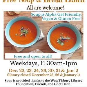 The West Tisbury Library will host an online Balance Series led by Kanta Lipsky. In this class, we will explore ways to strengthen our connection to the earth and increase our bodies’ ability to maintain good balance. No yoga mat needed, but a chair will be necessary for some of the movements. Classes will meet , ...Free Soup & Bread Lunch11:30 am - 1:00 pm