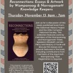 Join us Thursdays from 5:00pm to 6:00pm, for the Stitch Society Craft Group with Laura & Rachel. Drop-in and work on your project. Needle felting, embroidery, needlework, and more. , ...(Virtual) Author Talk – Reconnections: Essays & Artwork by Wampanoag & Narragansett Knowledge Keepers6:00 pm - 7:00 pm