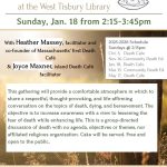 On Sunday, January 18, from 2:15-3:45, all are welcome to join us at the West Tisbury Library for a Death Café hosted by Heather Massey, facilitator and co-founder of Massachusetts’ first Death Café and island Death Café facilitator Joyce Maxner. This gathering will provide a comfortable atmosphere in which to sh , ...