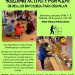 Enjoy a room filled with parachutes, scarves, bubbles, music and more to explore! Recommended for ages 0-5 , ...CLASS FULL! Writing Workshop Series with Moira Silva11:30 am - 1:00 pmRegistration is full. Starting January 13th, the West Tisbury Library will host a four-week writing workshop series with Moira Silva on Tuesdays from 11:30am-1pm: 1/13, 1/20, 1/27, 2/3. These sessions will meet in-person at the library. Please contact wt_mail@clamsnet.org to sign up. Space is limited. Participants are , ...Learning Lab (Grades 4+)3:00 pm - 5:00 pm