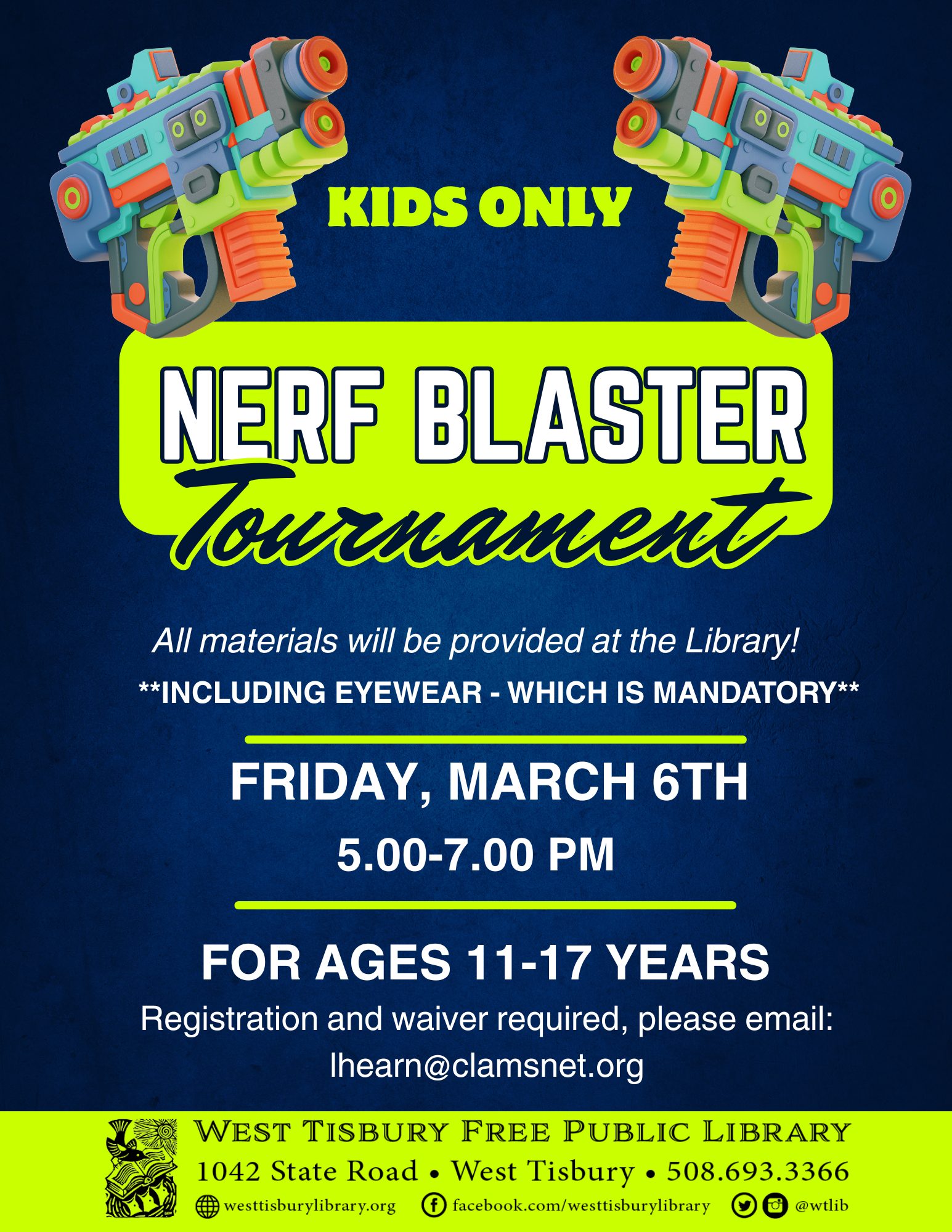 📣 JOIN US FOR AN AFTER HOURS NERF BATTLE AT THE LIBRARY! Ages 11-17, registration required. Email lhearn@clamsnet.org or call 508-693-3366 to register.