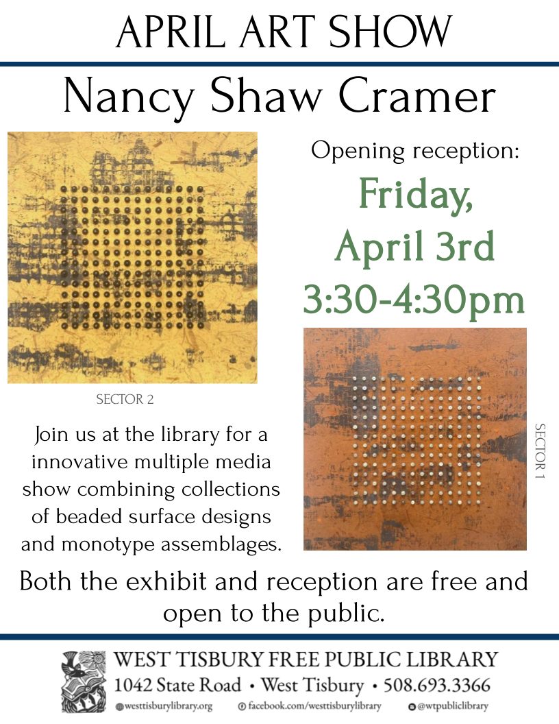 The West Tisbury Free Public Library is happy to welcome West Tisbury artist Nancy Shaw Cramer to the Community Room for the month of April. An accomplished weaver, Shaw Cramer is exhibiting her new work of beaded surface designs and monotype assemblages.