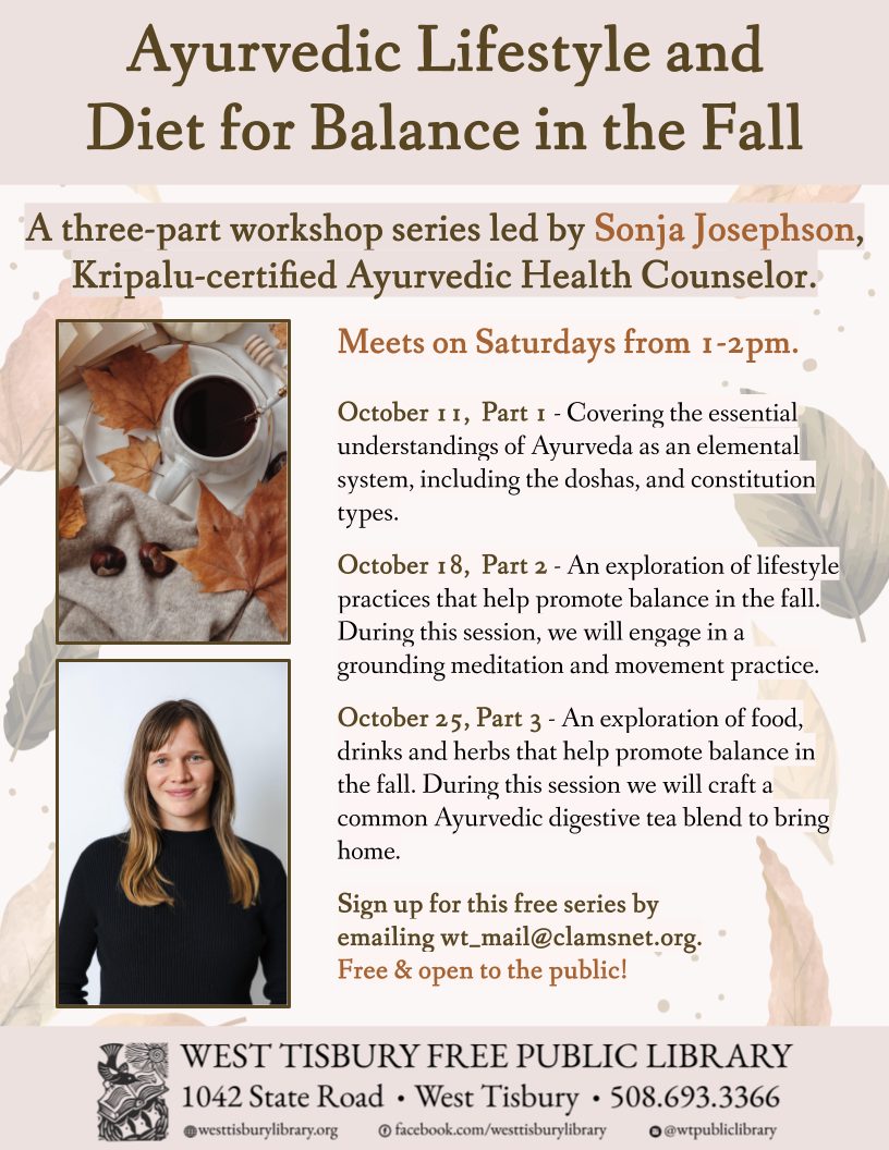 This October, join us at the West Tisbury Library for a 3-part workshop series led by Sonja Josephson, Kripalu-certified Ayurvedic Health Counselor. Come explore Ayurvedic diet, lifestyle and self-care practices for the fall season.