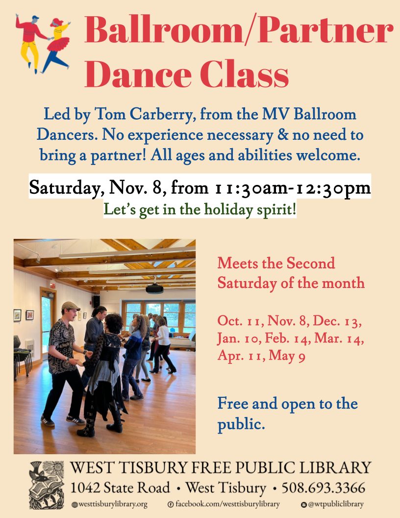 On the second Saturday of the month, from 11:30am-12:30pm, come to a free Ballroom/Partner Dance Class led by Tom Carberry, from the MV Ballroom Dancers. No experience necessary & no need to bring a partner! All ages and abilities welcome. Meets Oct. 11, Nov. 8, Dec. 13, Jan. 10, Feb. 14, Mar. 14, Apr. 11, and May 9.