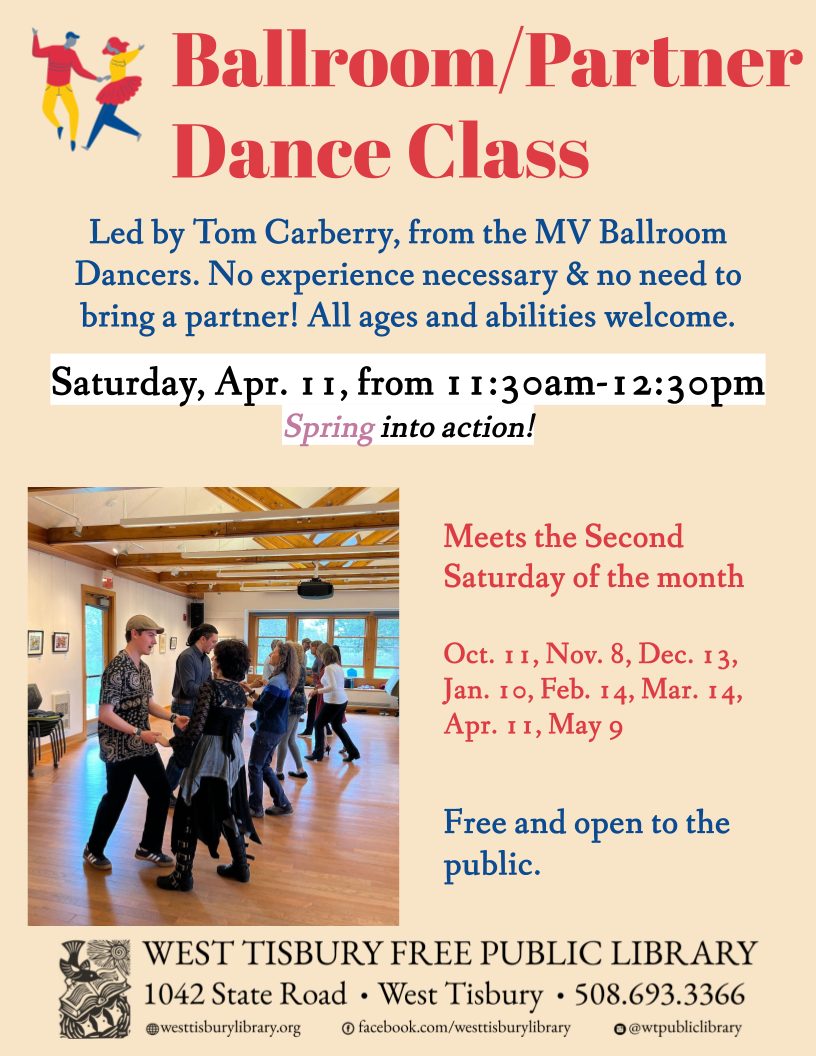 On the second Saturday of the month, from 11:30am-12:30pm, come to a free Ballroom/Partner Dance Class led by Tom Carberry, from the MV Ballroom Dancers. No experience necessary & no need to bring a partner! All ages and abilities welcome. Meets Oct. 11, Nov. 8, Dec. 13, Jan. 10, Feb. 14, Mar. 14, Apr. 11, and May 9.