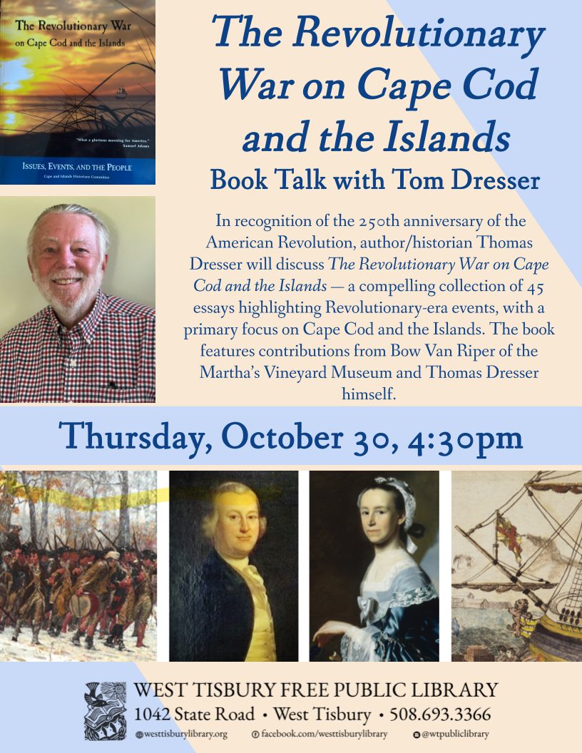 Join us on Thursday, October 30 at 4:30pm at the West Tisbury Library for a talk by author and historian Thomas Dresser. In recognition of the 250th anniversary of the American Revolution, Thomas will discuss The Revolutionary War on Cape Cod and the Islands — a compelling collection of 45 essays highlighting Revolutionary-era events, with a primary focus on Cape Cod and the Islands. The book features contributions from Bow Van Riper of the Martha’s Vineyard Museum and Thomas Dresser himself. Free and open the public.