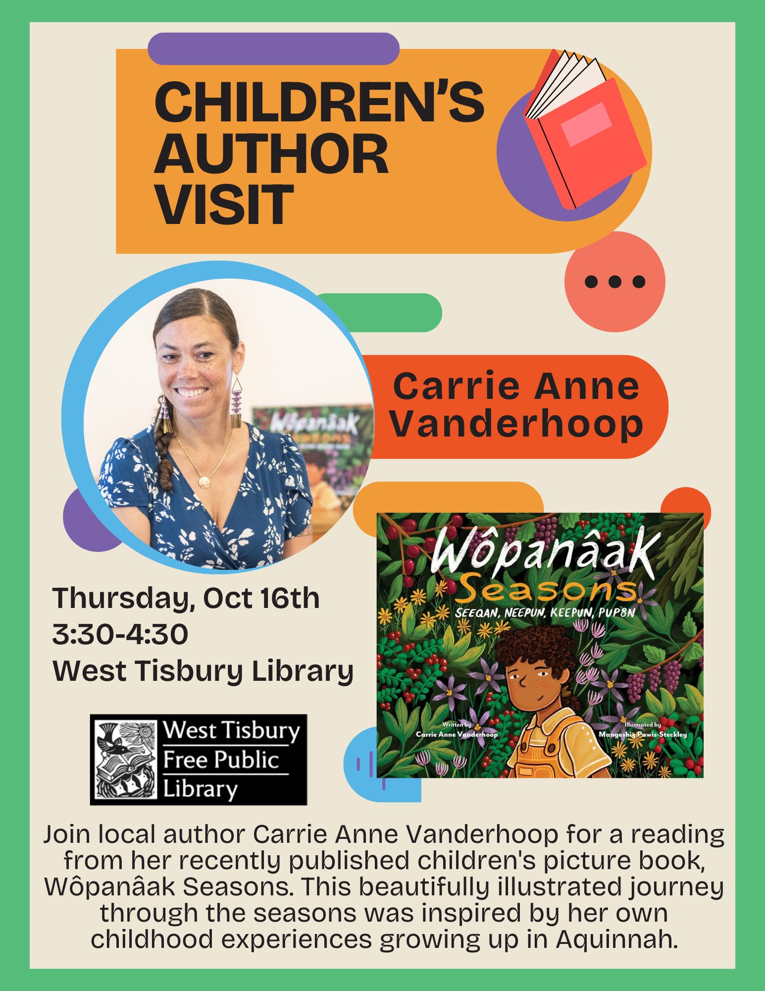 Join local author Carrie Anne Vanderhoop for a reading from her recently published children’s picture book, Wôpanâak Seasons. This beautifully illustrated journey through the seasons was inspired by her own childhood experiences growing up in Aquinnah.