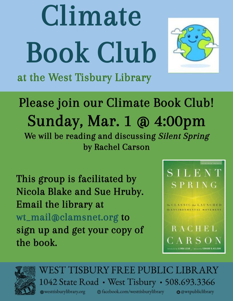 Come join us for our Climate Book Club at the West Tisbury Library!  Our next meeting will be Sunday, March 1, at 4:00pm. We will be reading and discussing Silent Spring by Rachel Carson.