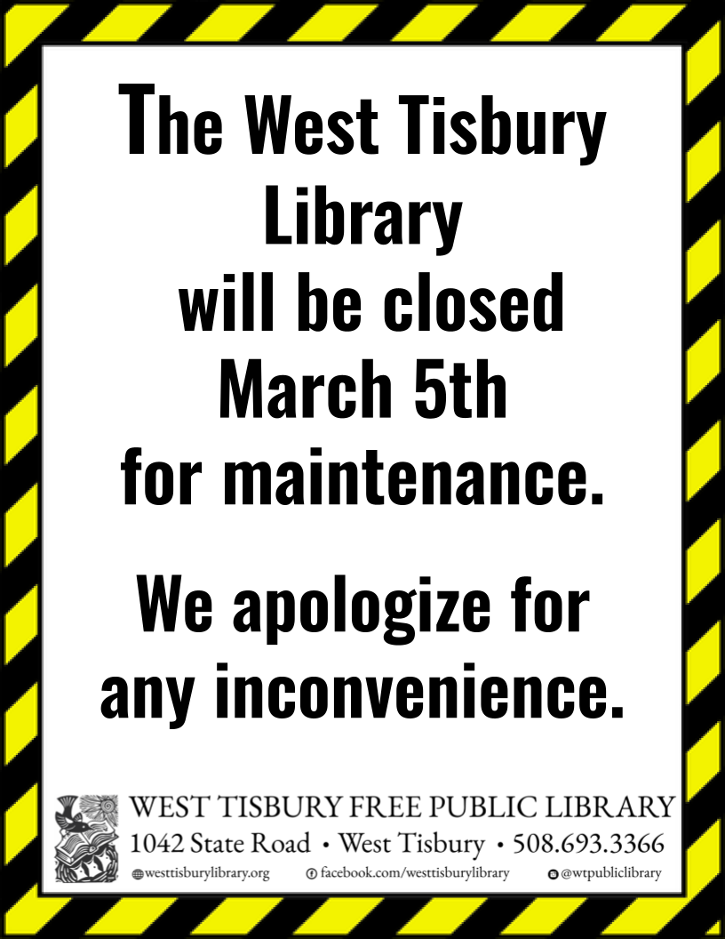 Closed for Maintenance The west Tisbury Library will be closed Thursday, March 5th for maintenance. We apologize for any inconvenience. + Add to Google Calendar + iCal / Outlook export Date Mar 05 2026 Expired! Time 9:00 am - 9:00 am Share this event Search our Website Search for: