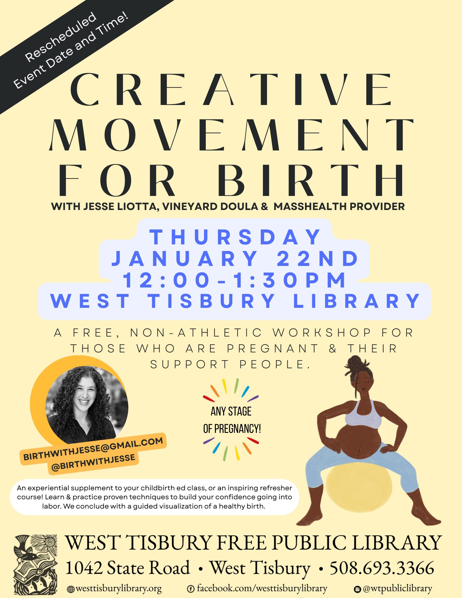 Creative Movement for Birth is a free, non-athletic workshop for those who are pregnant and their support people. This program is an experiential supplement to your childbirth ed class, or an inspiring refresher course! Learn & practice proven techniques to build your confidence going into labor. We conclude with a guided visualization of a healthy birth. All are welcome!