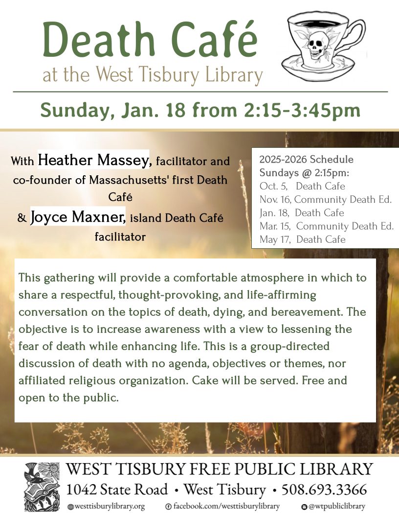 On Sunday, January 18, from 2:15-3:45, all are welcome to join us at the West Tisbury Library for a Death Café hosted by Heather Massey, facilitator and co-founder of Massachusetts’ first Death Café and island Death Café facilitator Joyce Maxner. This gathering will provide a comfortable atmosphere in which to share a respectful, thought-provoking, and life-affirming conversation on the topics of death, dying, and bereavement. This event is free and open to the public, and cake will be served.