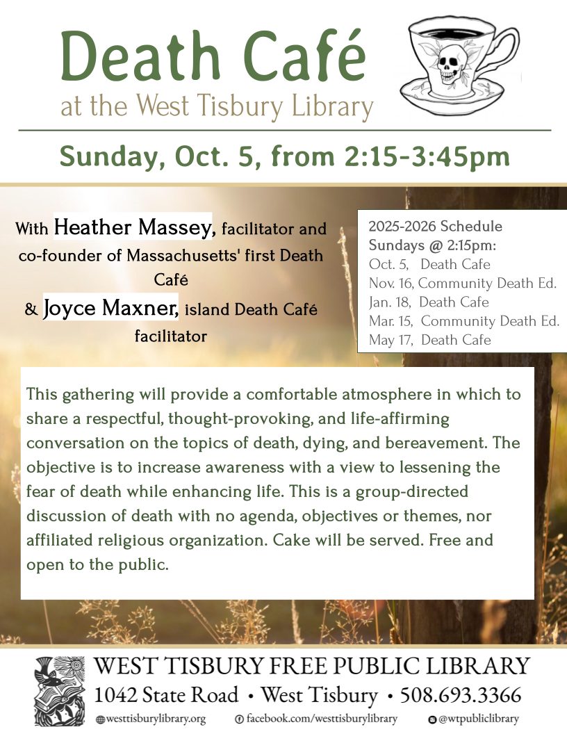 On Sunday, October 5, from 2:15-3:45, all are welcome to join us at the West Tisbury Library for a Death Café hosted by Heather Massey, facilitator and co-founder of Massachusetts’ first Death Café and island Death Café facilitator Joyce Maxner. This gathering will provide a comfortable atmosphere in which to share a respectful, thought-provoking, and life-affirming conversation on the topics of death, dying, and bereavement. This event is free and open to the public, and cake will be served.