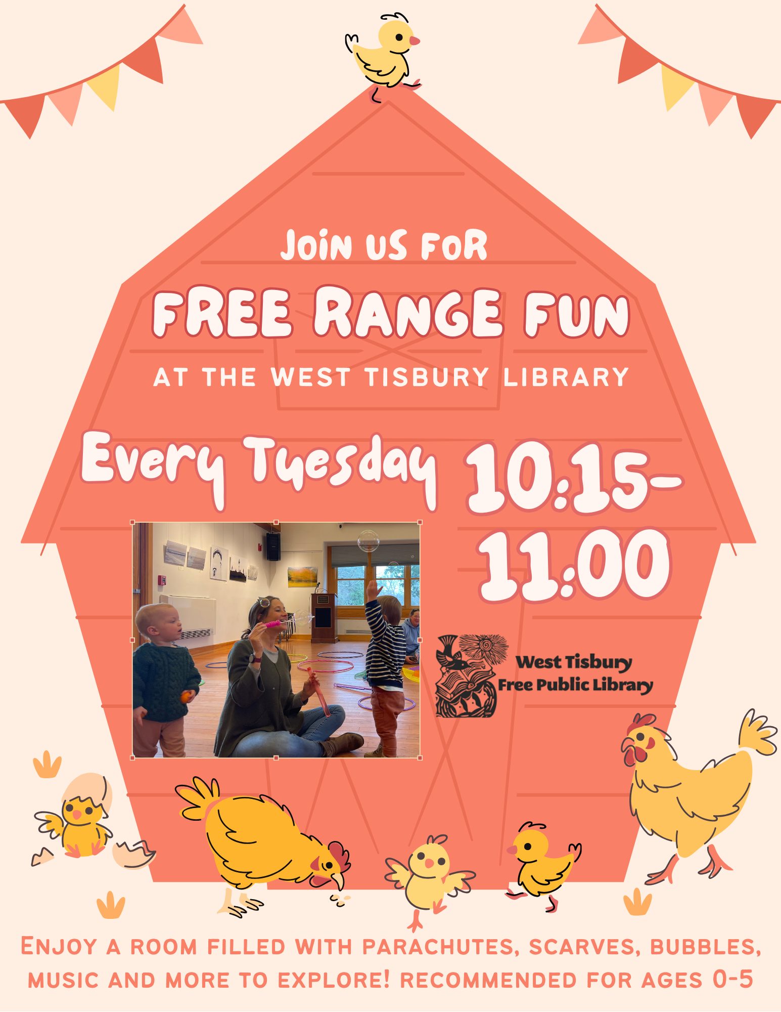 Free Range Fun Enjoy a room filled with parachutes, scarves, bubbles, music and more to explore! Recommended for ages 0-5 + Add to Google Calendar + iCal / Outlook export Date Jan 06 2026 Time 10:15 am - 11:00 am Share this event Search our Website Search for: