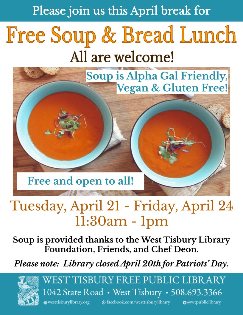 Lunch for all will be served every open weekday from 11:30am-1pm: Tuesday, April 21-Friday, April 24 (the library will be closed Monday, April 20 for Patriots’ Day). Soup is provided thanks to the West Tisbury Library Foundation, Friends, and Chef Deon.