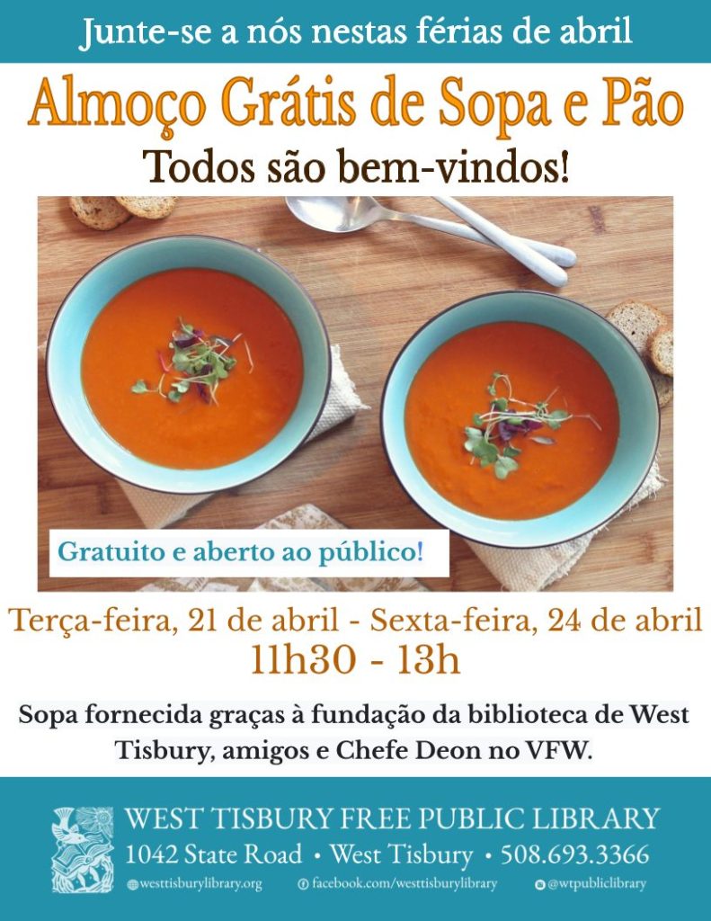 O almoço será servido para todos os dias úteis, das 11h30 às 13h, de terça-feira, 21 de abril, a sexta-feira, 24 de abril (a biblioteca estará fechada na segunda-feira, 20 de abril, devido ao Dia dos Patriotas). A sopa é oferecida pela Fundação da Biblioteca de West Tisbury, Amigos da Biblioteca e Chef Deon.