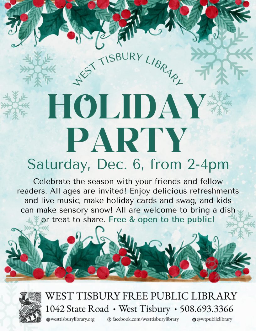 On Saturday, December 6, from 2-4pm, the community is invited to the West Tisbury Library’s Annual Holiday Party! Celebrate the season with your friends and fellow readers! All ages are invited. Enjoy delicious refreshments and live music, make holiday cards and swag, and kids can make sensory snow! All are welcome to bring a dish or treat to share. Free and open to the public.