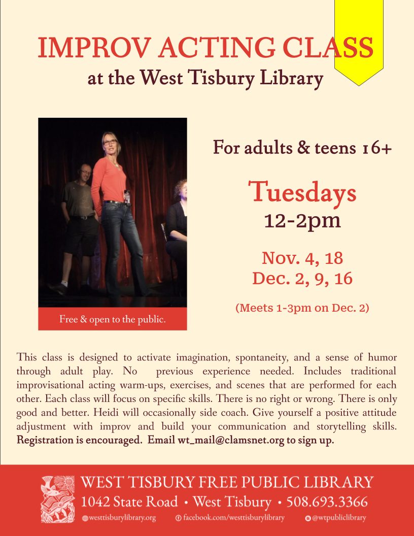 Join us at the West Tisbury Library for improv acting class with instructor Heidi Drew on Tuesdays, from 12-2pm. Sign up is encouraged by emailing wt_mail@clamsnet.org. Free and open to the public. Meets Nov. 4, Nov. 18, Dec. 2, Dec. 9, Dec. 16. (Meets 1-3pm on Dec. 2)