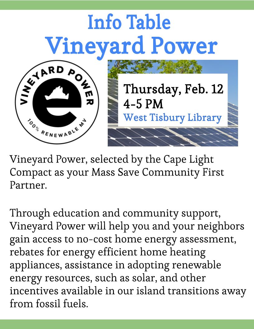On Thursday, Feb. 12, from 4-5pm, come meet Vineyard Power at the West Tisbury Library. Free and open to the public.
