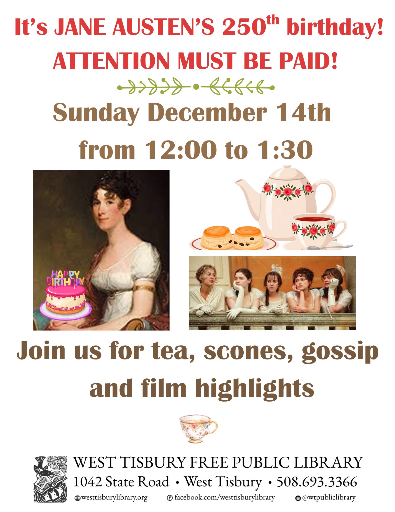 Join us at the West Tisbury Library on Sunday, December 14th from 12-1:30pm as we celebrate Jane Austen’s 250th birthday! Enjoy tea, scones, gossip, and film highlights from beloved adaptations. This special gathering invites you to enjoy a cozy afternoon in honor of one of literature’s brightest and most enduring icons. Free and open to the public!