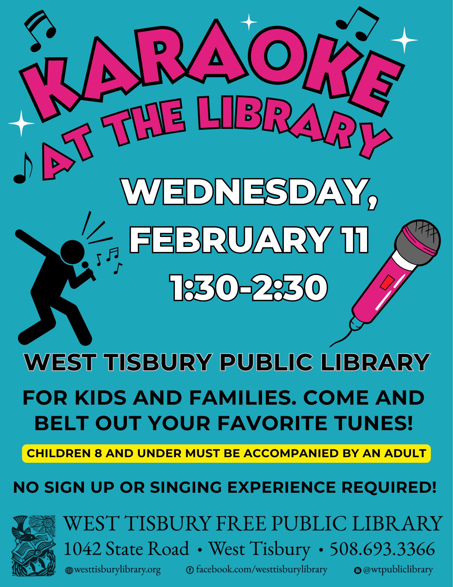 On Wednesday, February 11th, 2026 from 1:30-2:30pm, spend the half day off from school singing your favorite karaoke songs and jamming with friends! All ages welcome, anyone under 8 must be accompanied by an adult at all times. No sign up or singing experience required!