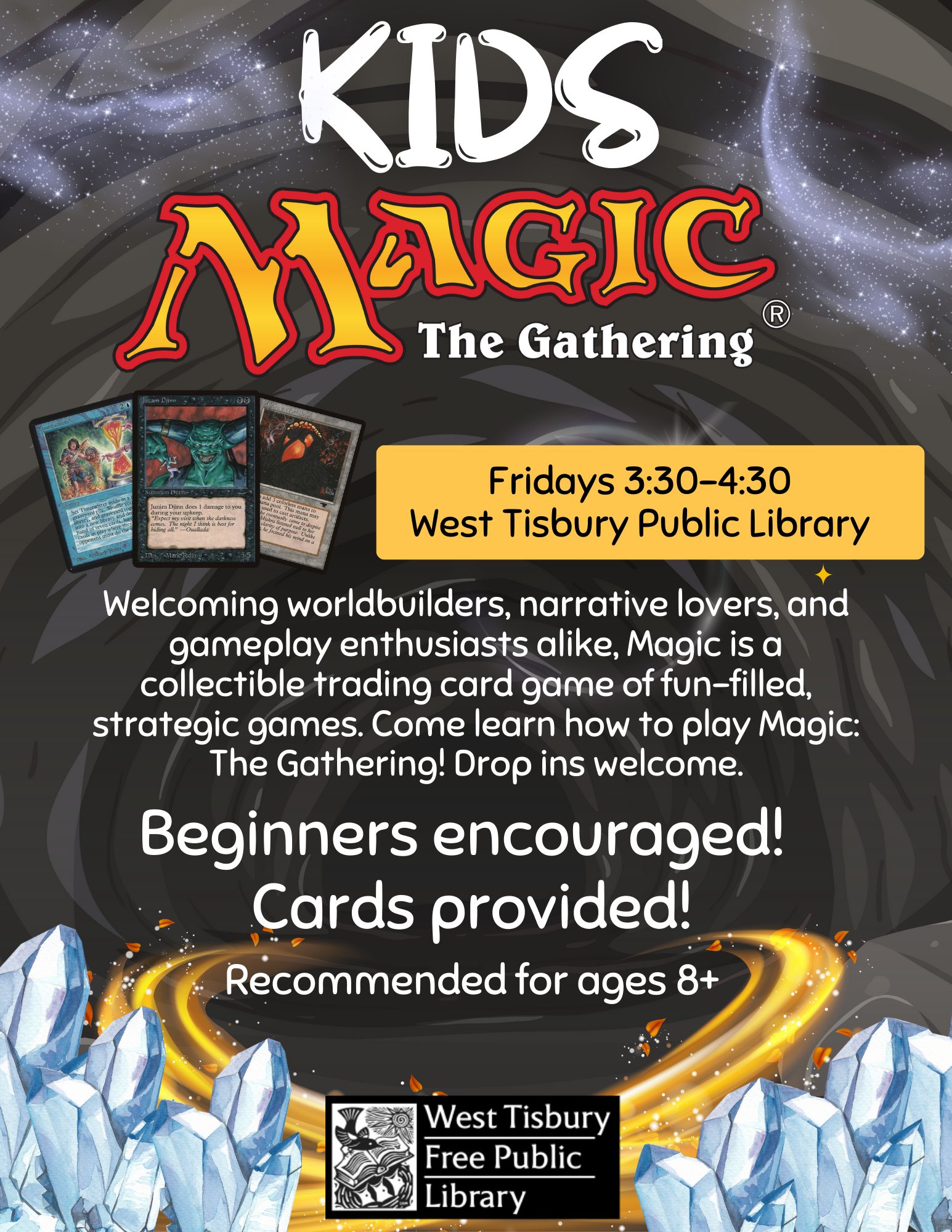 Kid’s Magic: The Gathering Kids Club! Beginners are encouraged, and cards are provided. Welcoming worldbuilders, narrative lovers, and gameplay enthusiasts alike, Magic is a collectible trading card game of fun-filled, strategic games. Come learn how to play Magic: The Gathering! Drop ins welcome. Recommended for ages 8+