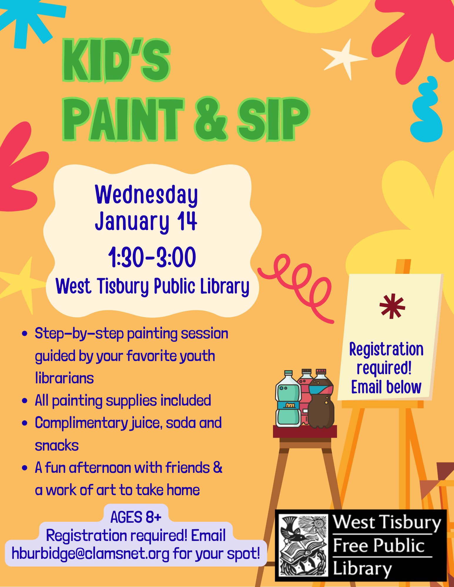 Kids’ Paint and Sip is a fun, guided art party where children follow an instructor step-by-step to create their own masterpiece. With snacks and kid-friendly “sips” like juice and soda, join in this fun activity that builds creativity and confidence. For ages 8+