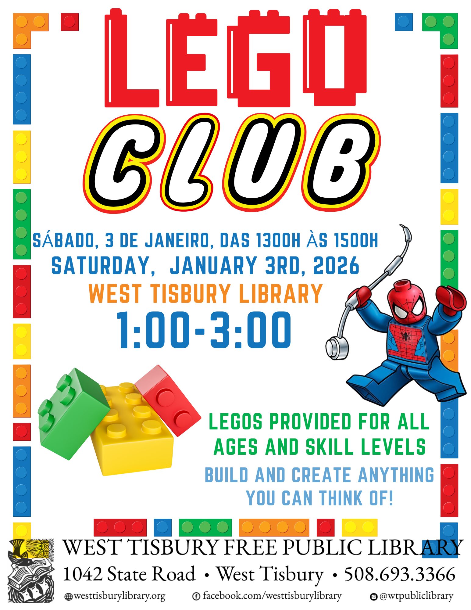 The West Tisbury Library will be hosting its Lego Club for all ages. Various sizes of Legos will be provided to suit various age groups. Come with a friend or meet friends at the library! Build a monster! A castle! The city of your dreams! All ages welcome