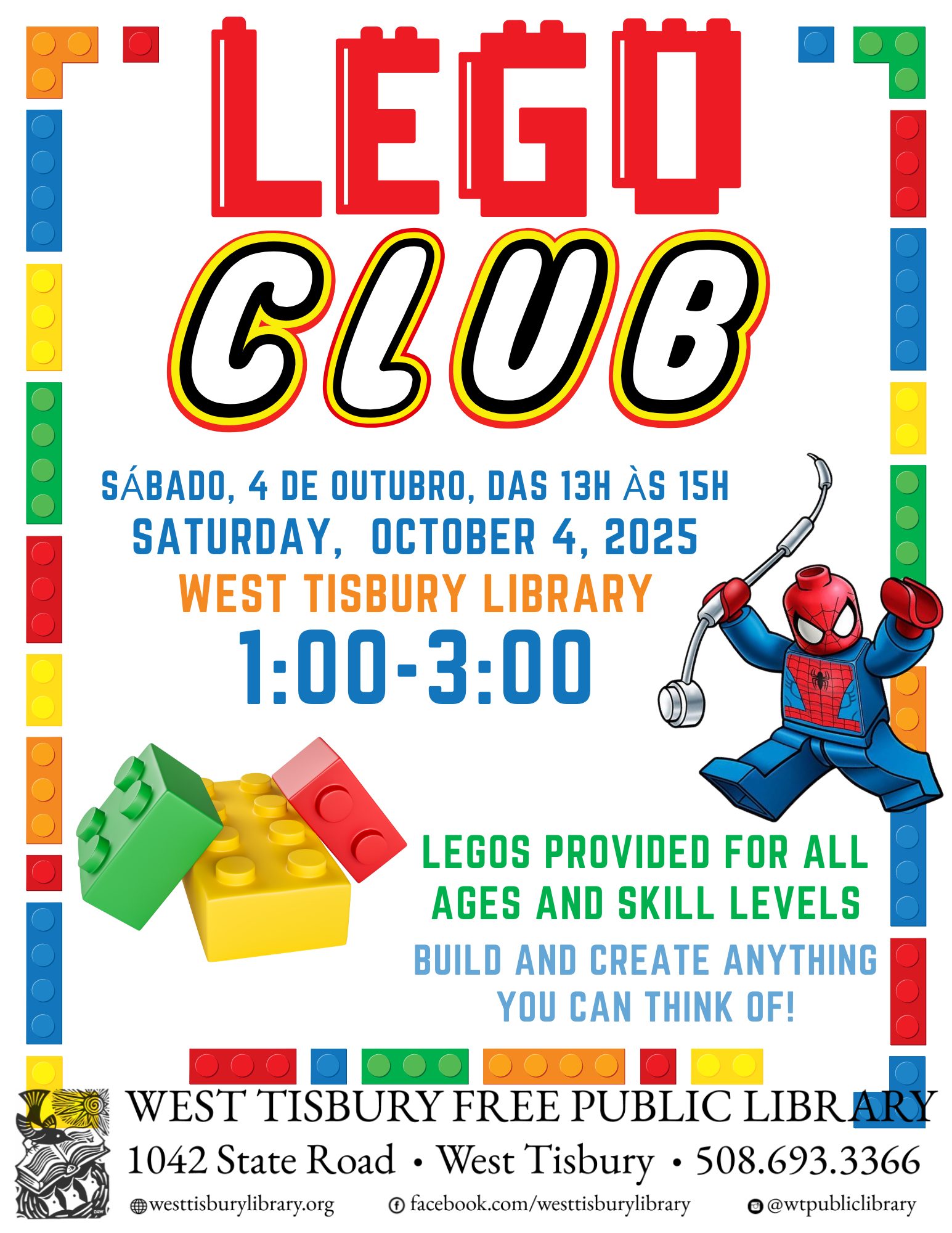 The West Tisbury Library will be hosting its Lego Club for all ages. Various sizes of Legos will be provided to suit various age groups. Come with a friend or meet friends at the library! Build a monster! A castle! The city of your dreams! All ages welcome