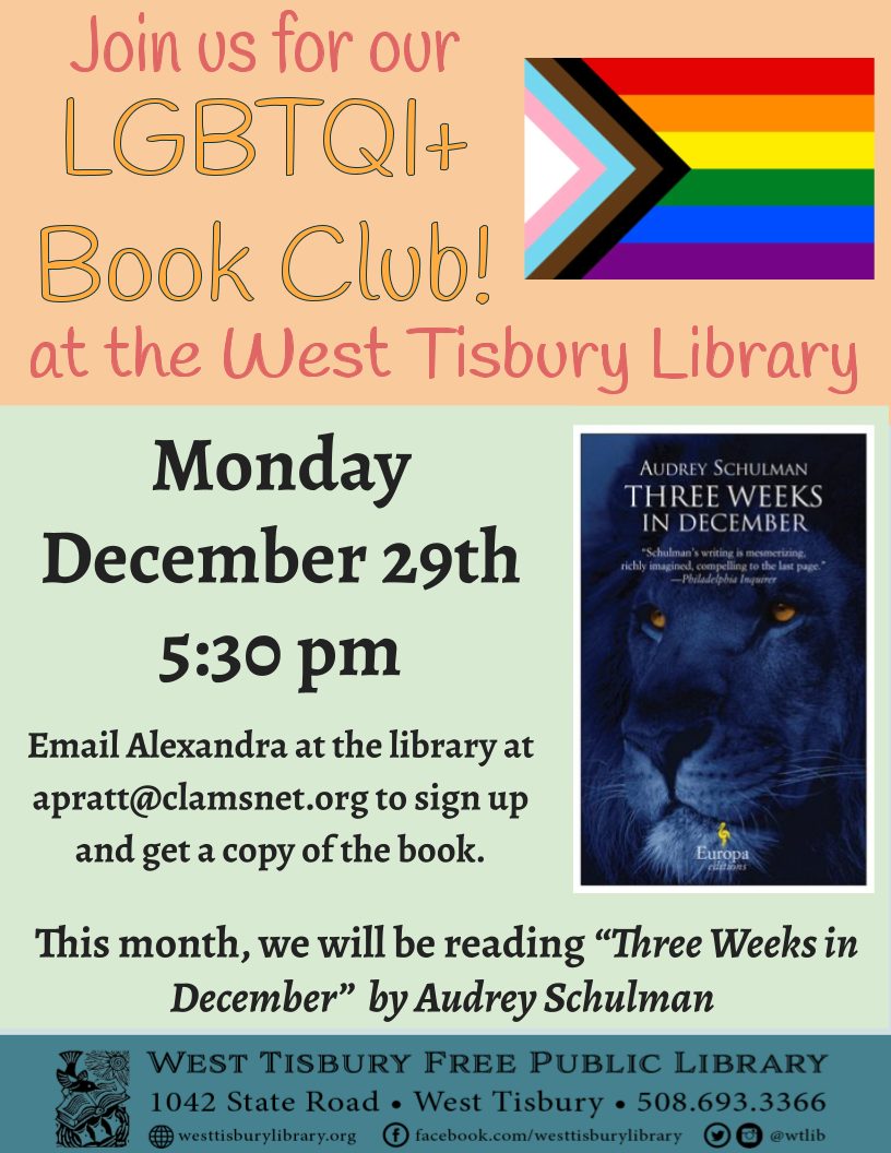 Join us at the West Tisbury Library on Monday, Nov. 24, at 5:30 PM for our LGBTQI+ Book Club! This month, we will be reading Three Weeks in December, by Audrey Schulman