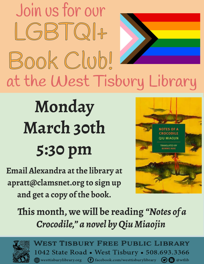 Join us at the West Tisbury Library on Monday, March 30, at 5:30 PM for our LGBTQI+ Book Club! This month, we will be reading “Notes of a Crocodile,” a novel by Qiu Miaojin