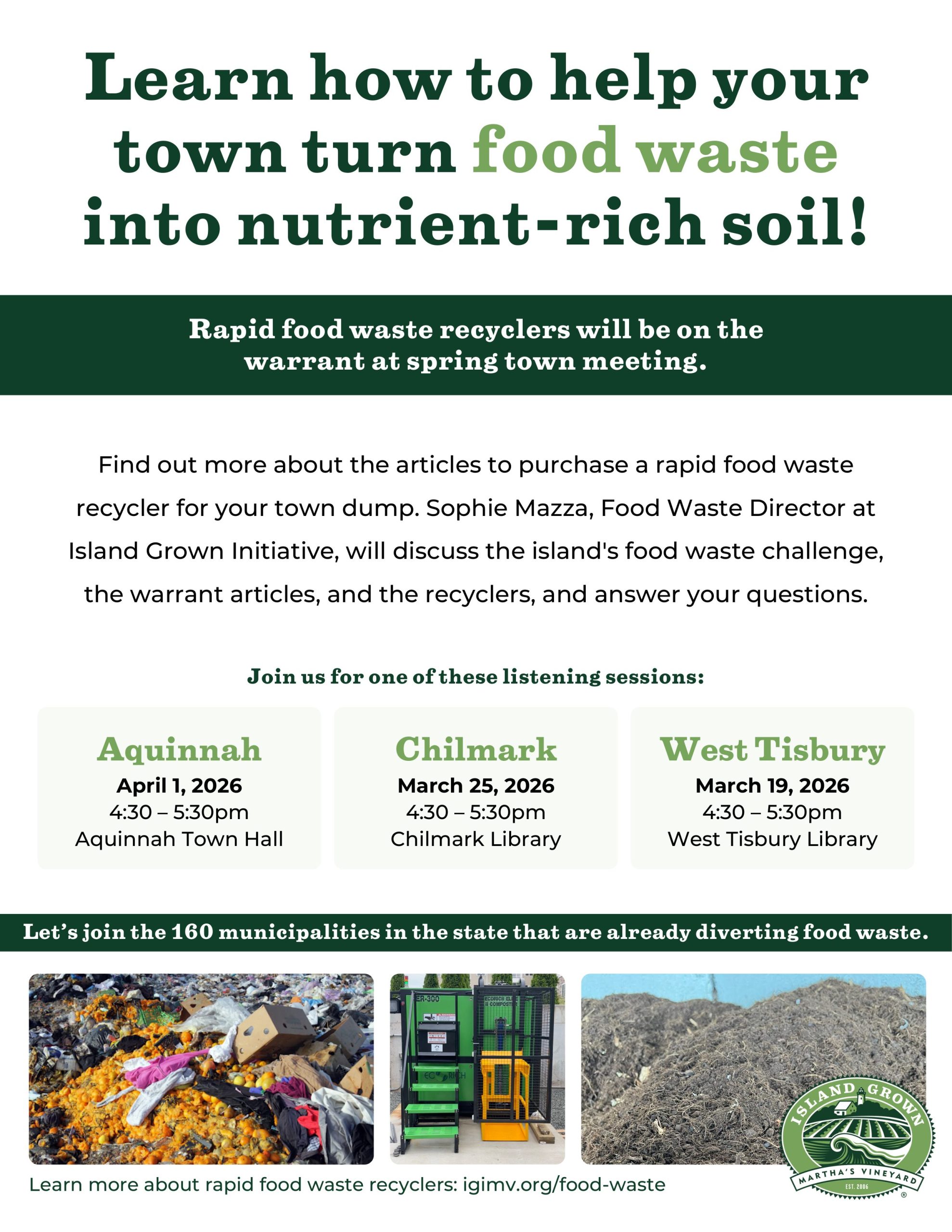 Find out more about the articles to purchase a rapid food waste recycler for your town dump. Sophie Mazza, Food Waste Director at Island Grown Initiative, will discuss the island’s food waste challenge, the warrant articles, and the recyclers, and answer your questions.
