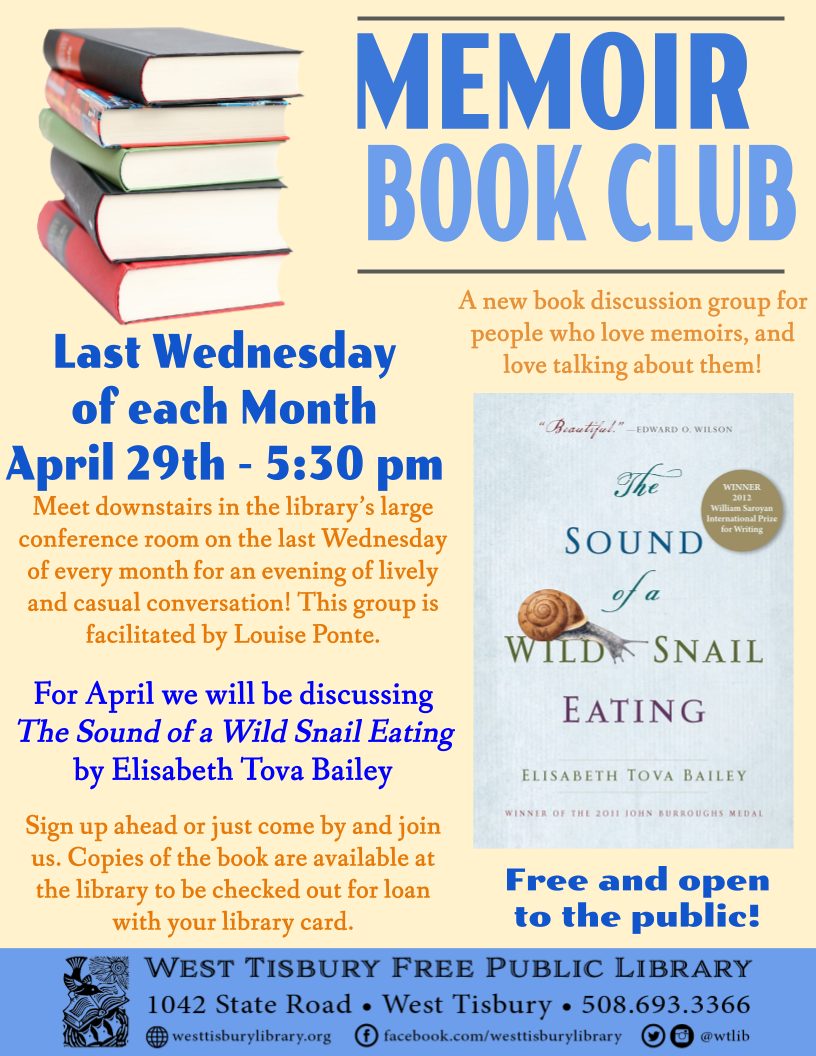 The West Tisbury Library is hosting a new memoir book discussion group facilitated by Louise Ponte. If you love to read memoirs, or have never read them and are curious, please join us on the last Wednesday of every month beginning on April 29th at 5:30 in the large conference room downstairs at the library. It is also a great opportunity for those writing a memoir or personal essays to get talking about the craft.