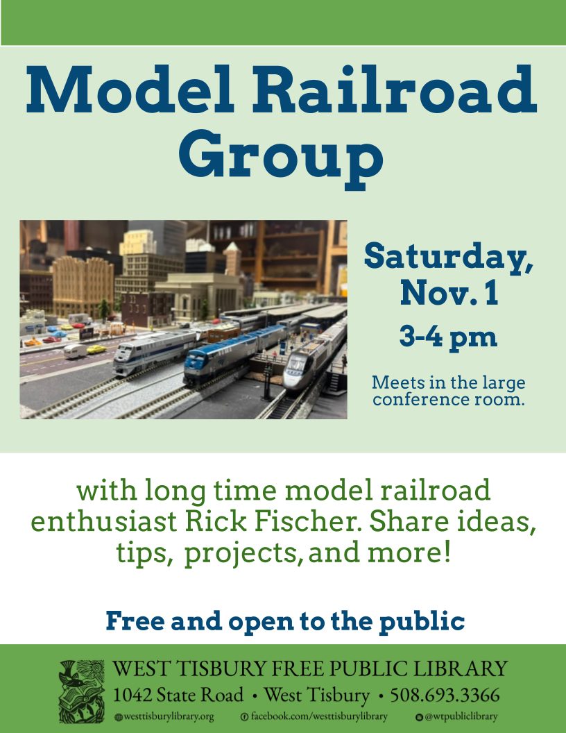 Come join us at a meeting of the new Model Railroad Group on Saturday, Nov. 1, at 3pm, at the West Tisbury Library. Meets downstairs in the large conference room. Share ideas, tips, projects, and more! This group is led by long time model railroad enthusiast Rick Fischer. Free and open to the public!