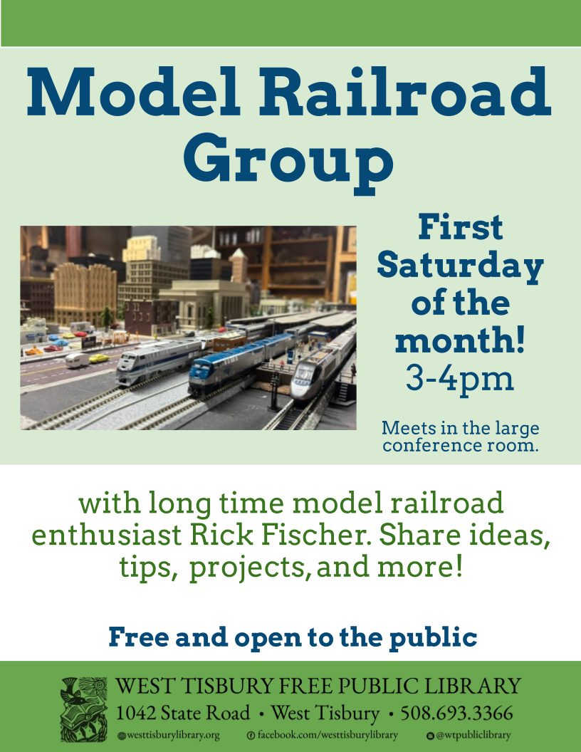 Come join us at a meeting of the Model Railroad Group on the first Saturday of each month! Meets 3-4pm, at the West Tisbury Library. Meets downstairs in the large conference room. Share ideas, tips, projects, and more! This group is led by long time model railroad enthusiast Rick Fischer. Free and open to the public!