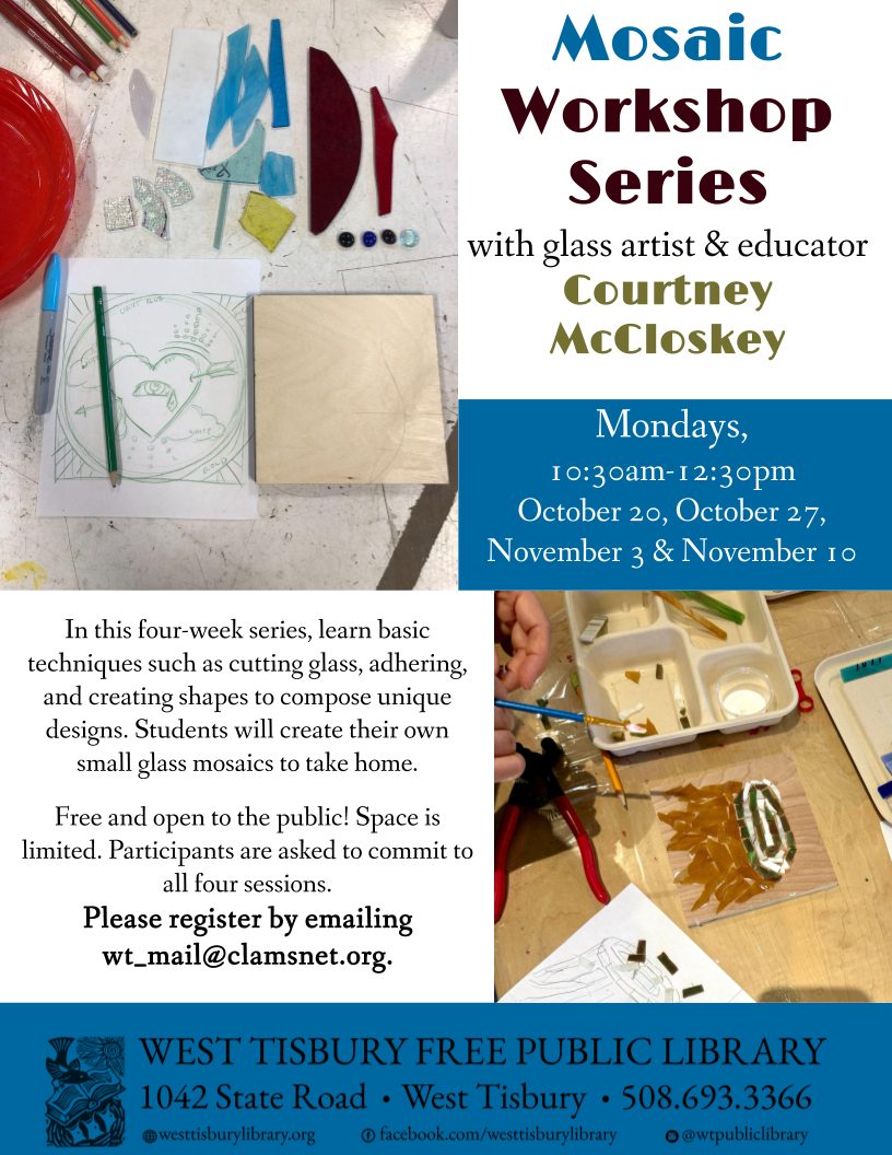 Join glass artist Courtney McCloskey at the West Tisbury Library for an exciting introduction to glass mosaics! In this four-week series, you will learn the basic techniques such as cutting glass, adhering, and creating shapes to compose unique designs. Students will create their own small glass mosaics that they will be able to take home.