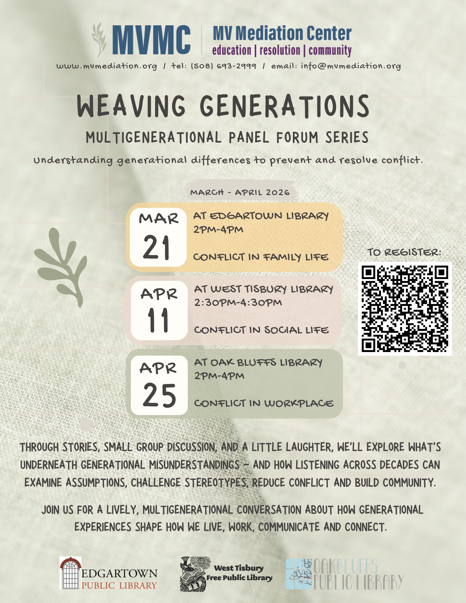 On Saturday, April 11, from 2:30-4:30pm, at the West Tisbury Library, Martha’s Vineyard Mediation Center presents a discussion on “Conflict in Social Life.” Free and open to the public.