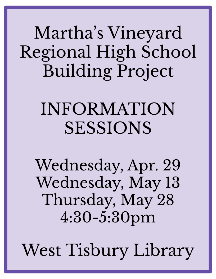 Martha’s Vineyard Regional High School (MVRHS) will host public Building Project Information Sessions this spring at the West Tisbury Library: Wednesday, Apr. 29, Wednesday, May 13, and Thursday, May 28, from 4:30-5:30pm. These sessions are open to community members, families, and stakeholders interested in learning more about the MVRHS building project and the planning process underway for a modern, safe, and functional school facility.
