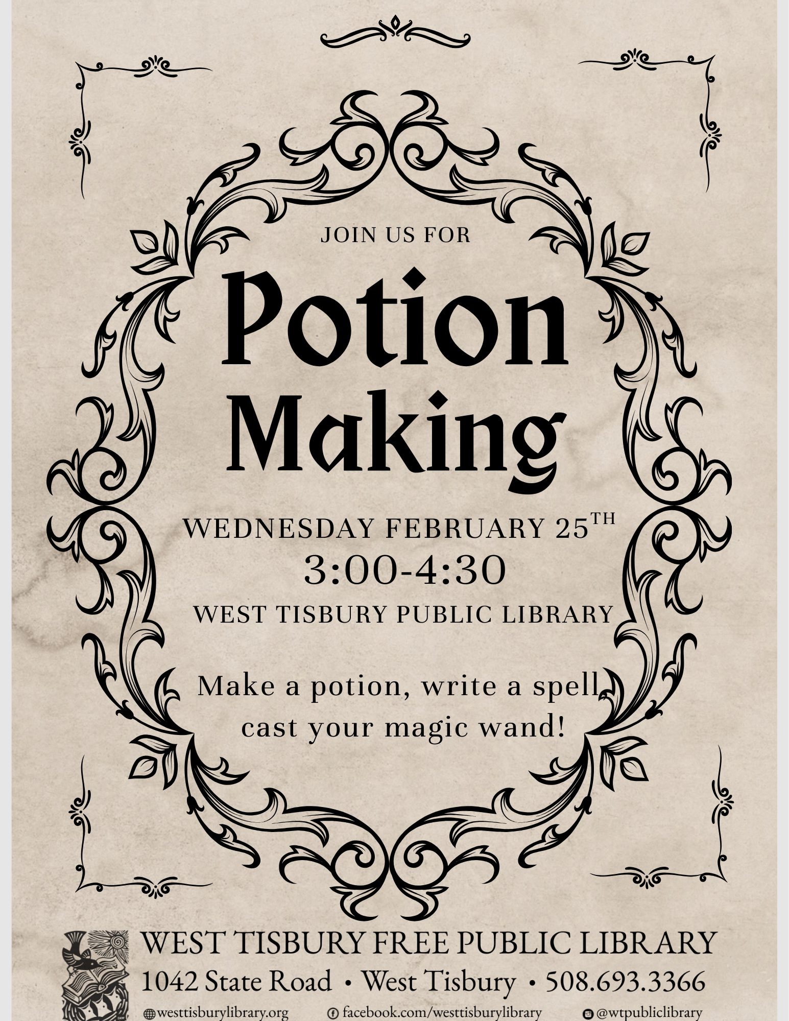 Kid’s Potion Making is a fun, imaginative sensory activity using simple ingredients to make their own take home potions. Kids of all ages are welcome to come play with a variety of natural elements to make colorful concoctions. We will also have spell writing and making your own wand. All ages welcome. Anyone under the age of 8 must have a responsible guardian with them at all times.