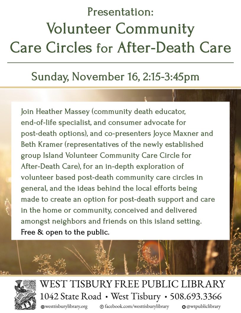 On Sunday, November 16, at 2:15pm, join us at the West Tisbury Library for a Death Education Presentation titled, “Volunteer Community Care Circles for After-Death Care.” Join Heather Massey (community death educator, end-of-life specialist, and consumer advocate for post-death options) and co-presenters Joyce Maxner and Beth Kramer, (representatives of the newly established group Island Volunteer Community Care Circle for After-Death Care), for an in-depth exploration of volunteer based post-death community care circles in general, and the ideas behind the local efforts being made to create an option for post-death support and care in the home or community, conceived and delivered amongst neighbors and friends on this island setting.