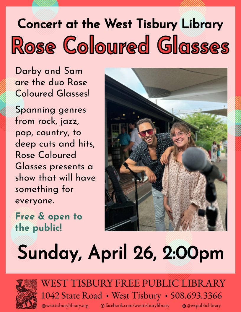“Darby and Sam are the duo Rose Coloured Glasses! These two goofballs are incredibly happy wherever they end up performing: Bad Martha’s, a wedding, or even a lonely alleyway! They are especially happy to make music for our wonderful community spaces. After doing damage in the libraries of Edgartown, Oak Bluffs and even on behalf of Vineyard Haven, Sam and Darby are excited to now disrupt readers with their music here, in West Tis! Spanning genres from rock, jazz, pop, country, to deep cuts and hits, Rose Coloured Glasses presents a show that will have something for everyone.”