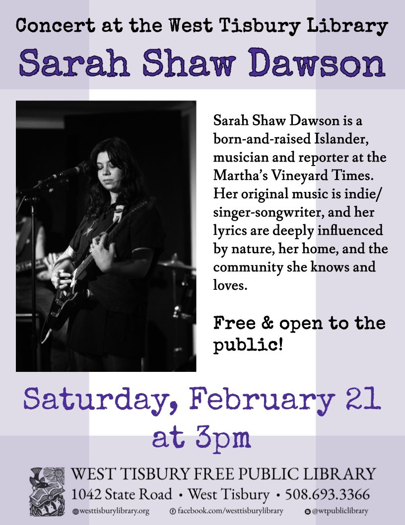 On Saturday, February 21, at 3pm, join us at the West Tisbury Library for a concert featuring Sarah Shaw Dawson. Free and open to the public!
